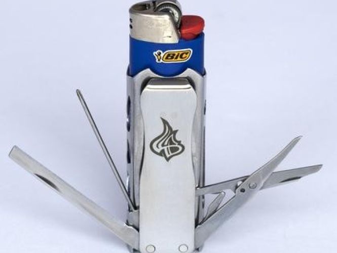 Ingenious multi-tool lighter case with a huge assortment of tools.