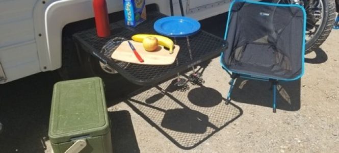 The steel, powder coated, tire mounted table is level, stable, VERY accessible. and weighs less than 13 pounds.