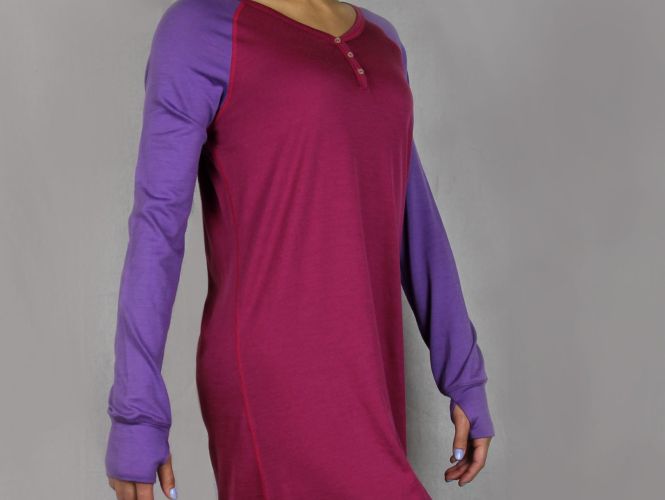Flowing, ultra-soft 3 button Henley nightshirt with raglan sleeves is perfect for cozy snuggling on a cold winter night. Flatlock stitching, shirttail hemline and cozy cuffs with thumb holes.