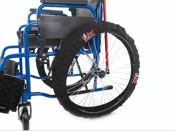 Universal wheel covers that prevent dirt and mud from your wheelchair wheels going on the carpet or the inside of your car.